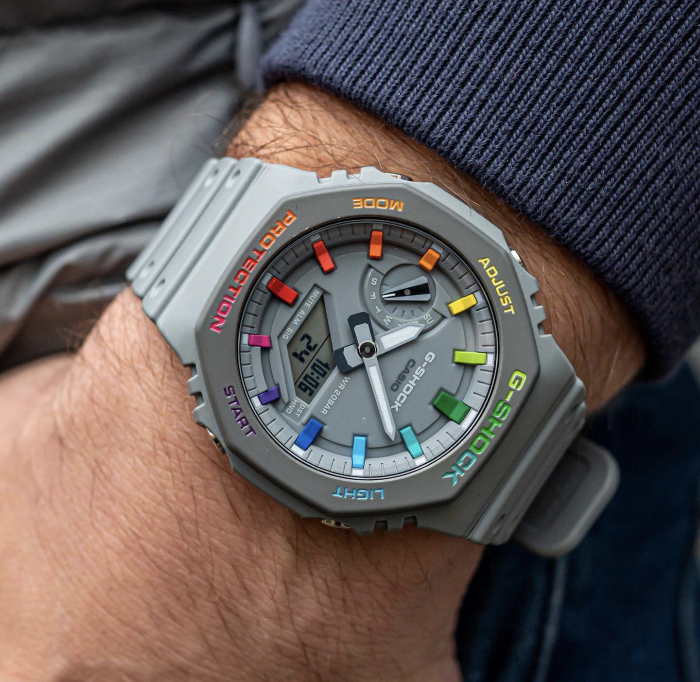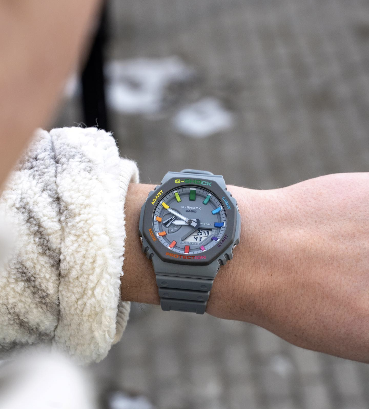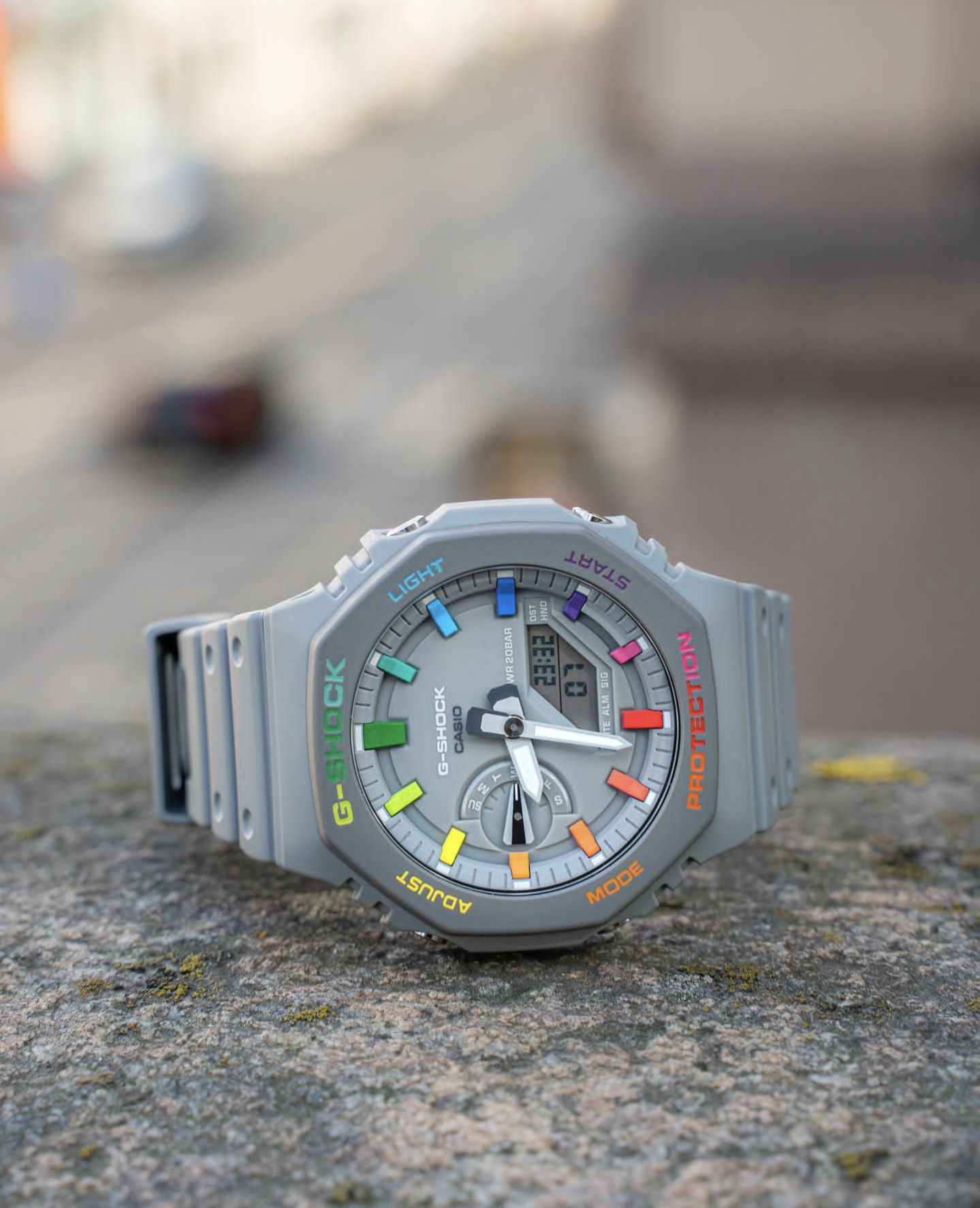 Casio GA-2100 Meticulously hand-painted hour markers and text on the bezel create the colorful Grey Rainbow version.