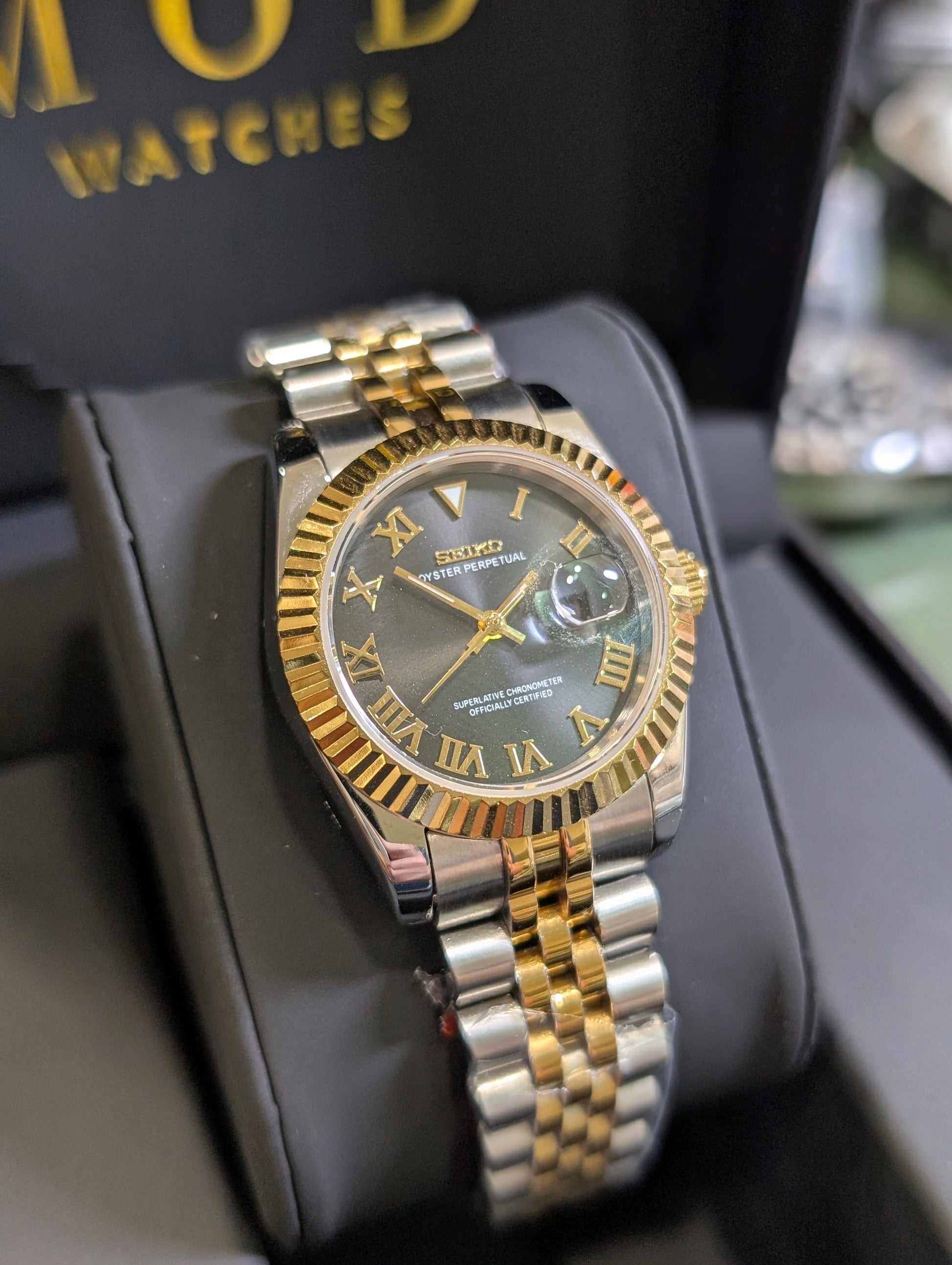 A Seiko Mod is a special watch hand-assembled from a prestigious Seiko automatic or hybrid movement, combined with high-quality aftermarket parts, usually made of 316L stainless steel.